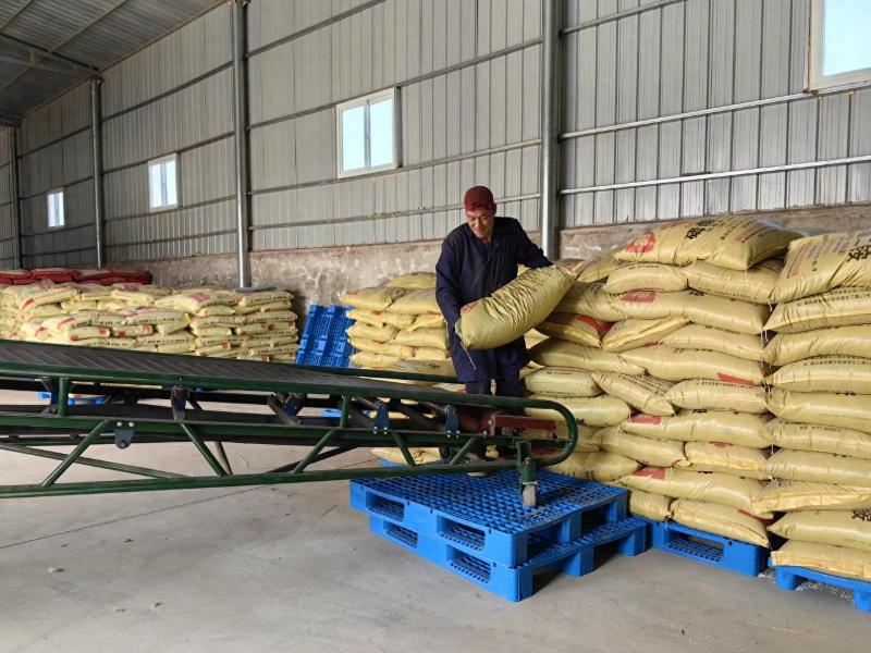 平罗县供销集团有限公司化肥储备库工人往传输带上搬运化肥。