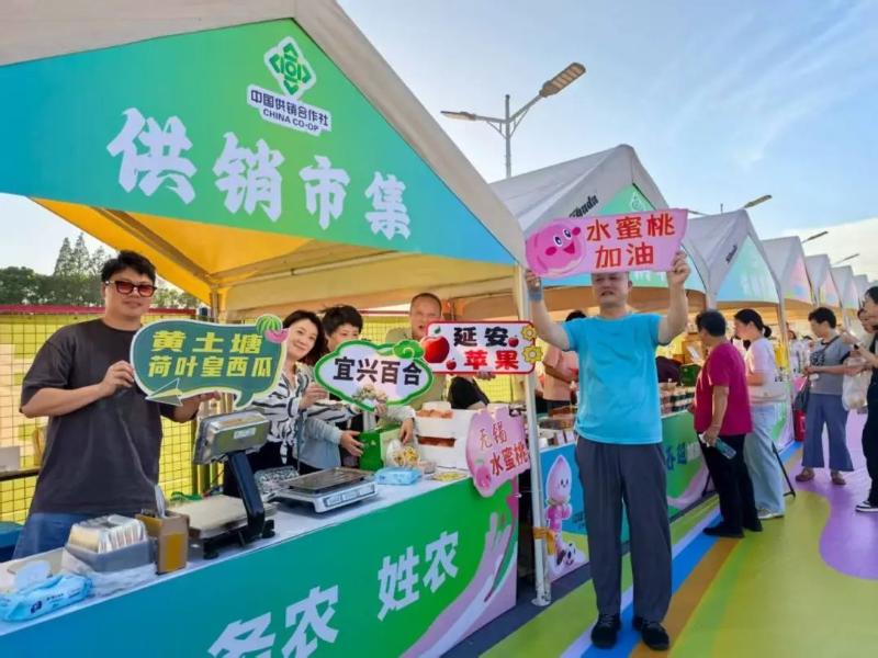 供销市集销售的琳琅满目的农特产品,构建起“可信、可看、可尝、可买、可传播”的“五可”市集体验。如潮的市民、球迷,穿梭于琳琅满目的摊位之间,逛供销市集、品特色食品、赏文创产品、增农旅知识,现场汇成一片欢乐兴奋的海洋。这场融合了“苏超”激情、供销助农与特色农品的供销市集展示展销活动,不仅强力宣传了供销社为农服务形象,更提升了地产农特产品的知名度,还增加了新型农业经营主体的销售收入。