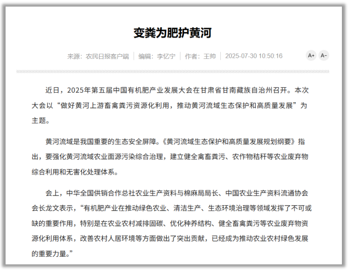 近日,2025年第五届中国有机肥产业发展大会在甘肃省甘南藏族自治州召开。本次大会以“做好黄河上游畜禽粪污资源化利用,推动黄河流域生态保护和高质量发展”为主题。